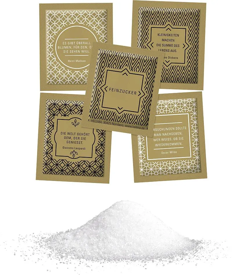 Diese hübschen Zuckertütchen, gefüllt mit Kristallzucker, bestechen durch ihr elegantes Design in Gold mit Musterung. Auf den Sachets finden sich zentral aufgedruckte Zitate über den Genuss von Berühmtheiten wie Charles Dickens, Henri Matisse und Oscar Wilde. Egal ob in der Gastronomie, im Büro oder Zuhause. Die praktischen Einzelportionen mit je 3,6 g Zucker lassen sich einfach öffnen und sichern eine hygienische Handhabung. | ![]() |